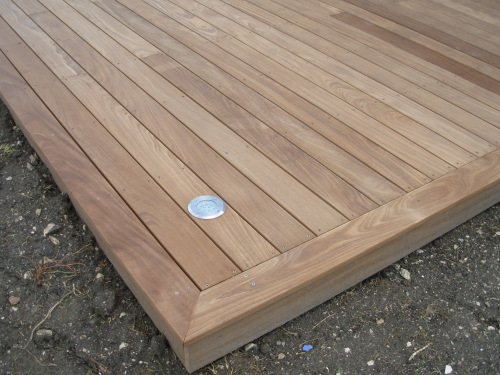 Succession de lames de finition coupées en anglets sur une terrasse en afrormosia