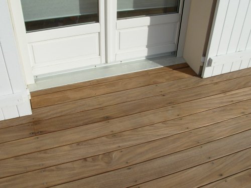 Finition de seuil de porte fenêtre sur terrasse en afrormosia