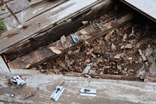 Là encore, la terrasse s’est dégradée rapidement pour deux raisons principales : une structure mal conçue, mal ventilée et en contact avec le sol, et des clips de fixation latéraux qui ne tiennent pas