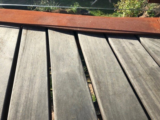 Quand on construit une terrasse en bois, mieux vaut rester simple et respecter les principes de pose élémentaires … Nous sommes intervenus chez ce client pour refaire la terrasse en bois. La structure principale a été construite en acier « Corten » ; c’est à dire de l’acier rouillé. La structure donnait entièrement satisfaction au client, étant donné le fait que c’était son choix esthétique.