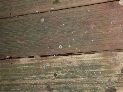 Les vis sont posées au hasard. Les rainures dans la lames n’empêchent pas la mousse et la moisissure de s’installer.