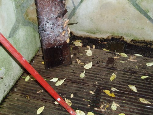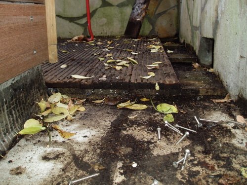 La vue par le côté est éloquente sur l’état de pourrissement de la terrasse.