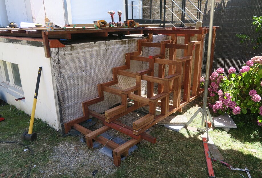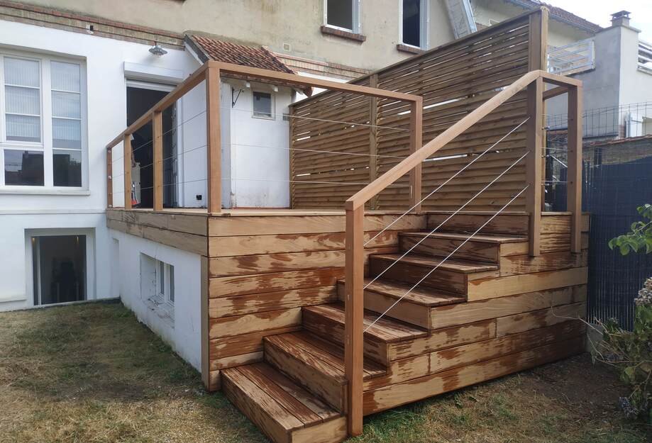 Nous avons réalisé une très jolie terrasse en bois pour cette maison des années 70. La terrasse a été construite sur un sous-sol surélevé. Nous y avons intégré un escalier e en bois avec un garde-corps en bois et en inox. Nous avons également installé un brise-vue en bois pour plus d’intimité.