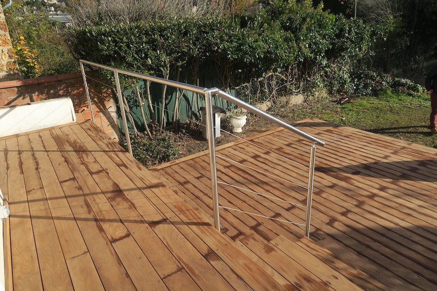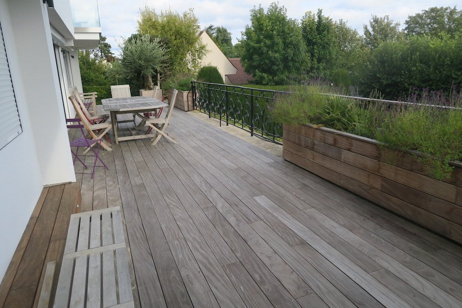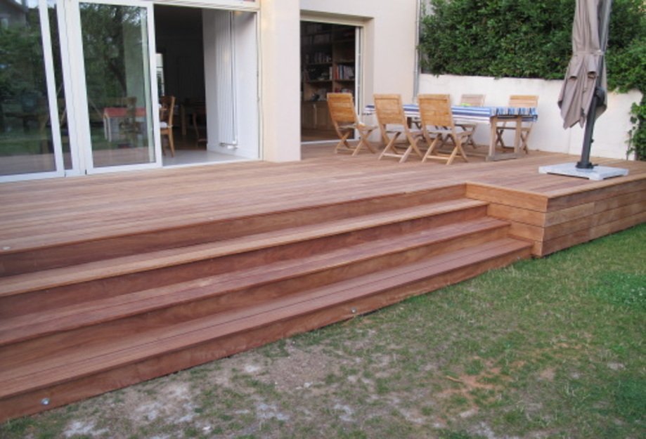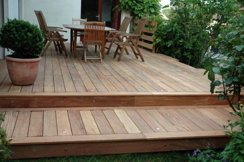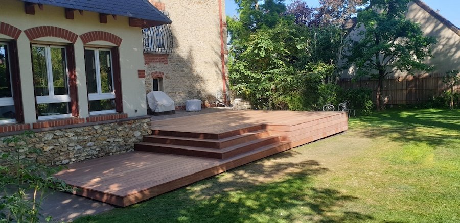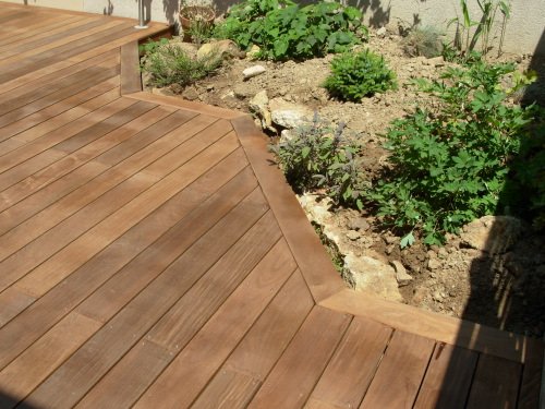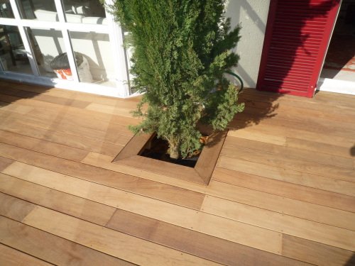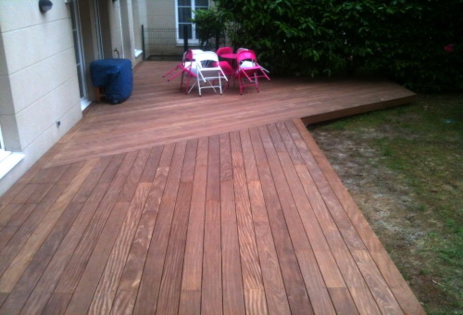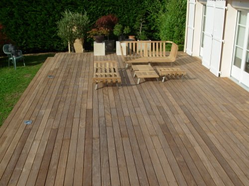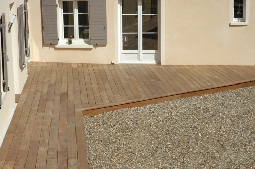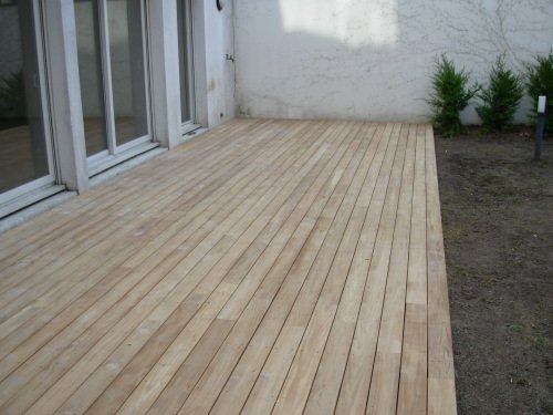 Les lambourdes sont toujours isolées du sol avec des cales ou des plots PVC. Les lambourdes et les lames de terrasse sont en bois exotique.