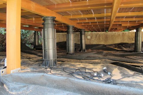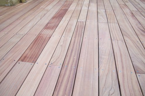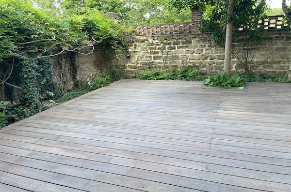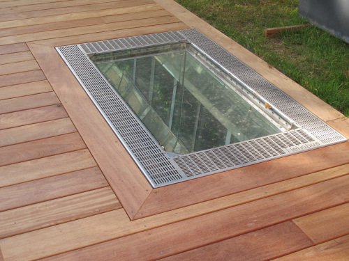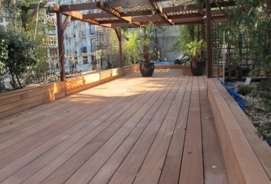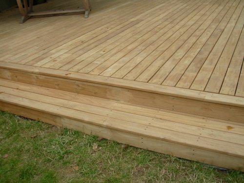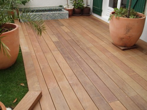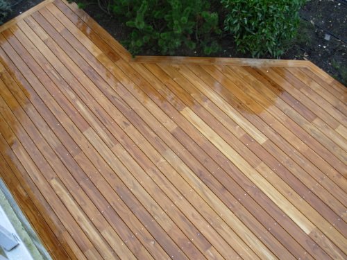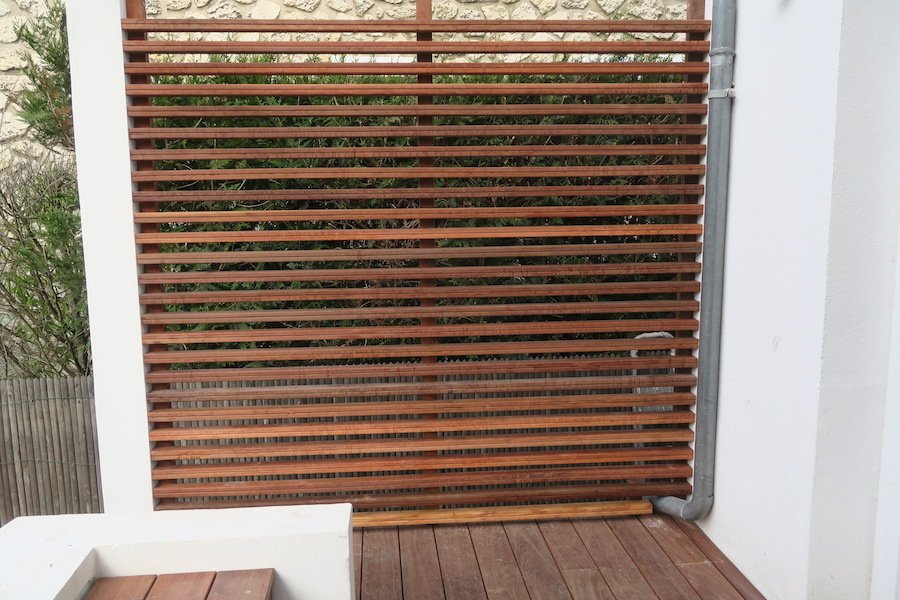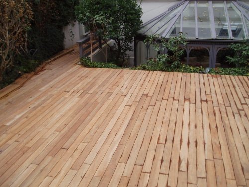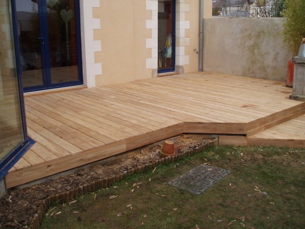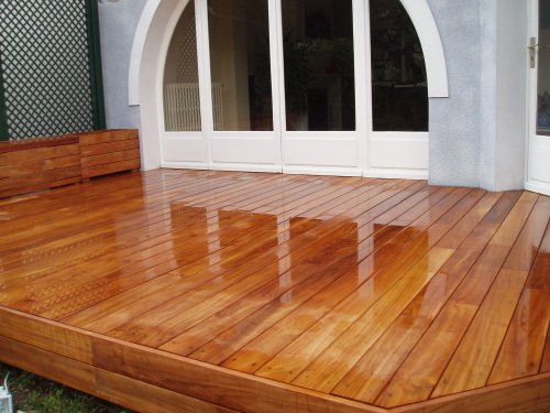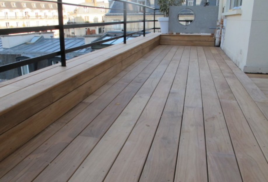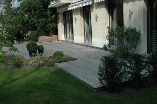 Les lambourdes sont toujours isolées du sol avec des cales ou des plots PVC. Les lambourdes et les lames de terrasse sont en bois exotique.
