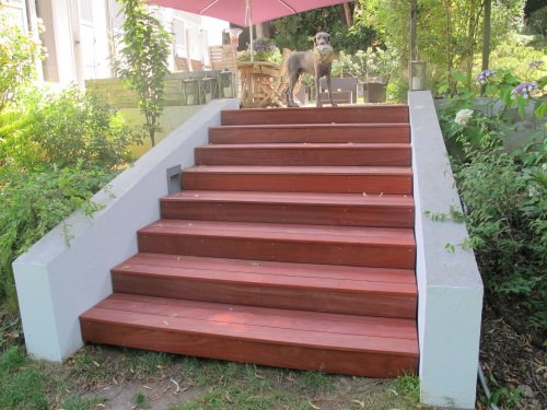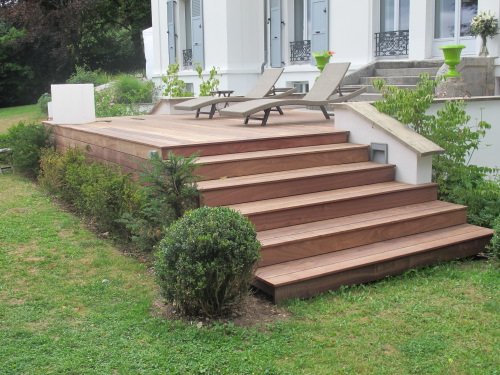 bel escalier en bois pour faciliter l’accès au jardin. lames en Padouk entières