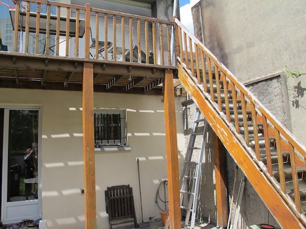 voici l’ancien balcon avec son escalier et son garde-corps en bois. Les multiples couches de vernis ou lasures inadaptés n’ont pas bien vieilli, la rampe était plutôt branlante.